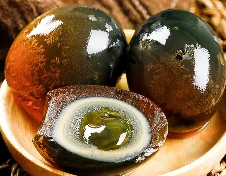 采用本地鸭蛋,经传统配方与腌制工艺制成,皮蛋蛋白晶莹透明、松花清晰,蛋黄溏心绵密,风味独特,是石阡特色美食技艺 。